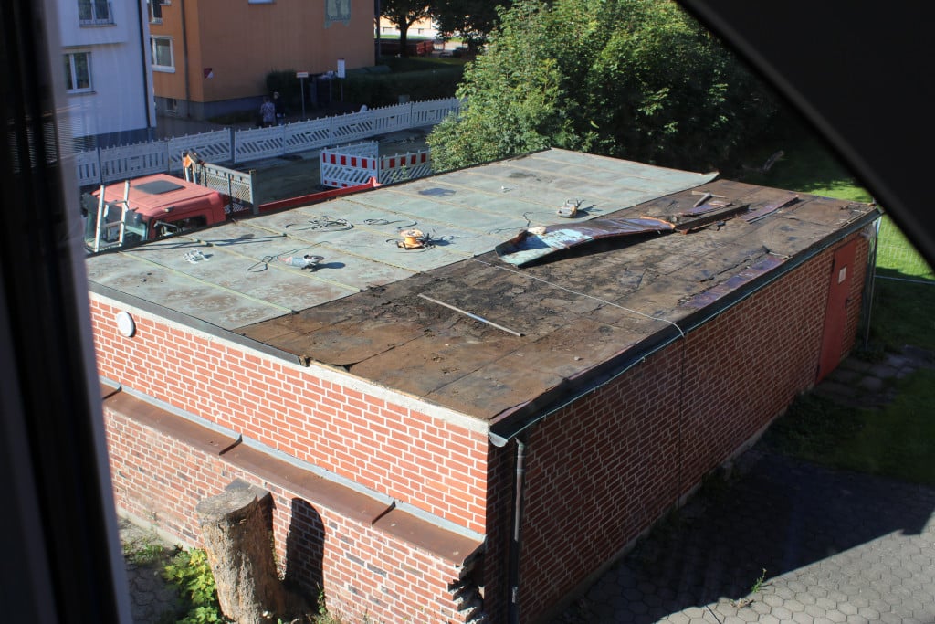 Bereits seit einigen Jahren heizt die KiTa mit Gas. Nun im Zuge des Umbaus wird auch der große Öltank gehoben, der im Südbereich (vor der Gruppe 1-3) im Boden vergraben ist.