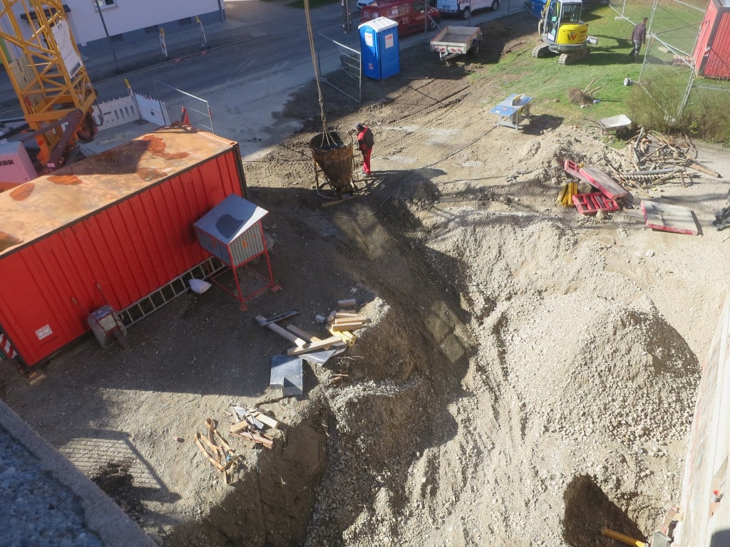 Anfang März hat der Bagger mit den Aushub angefangen. Er hat eine Baugrube für die Unterkellerung des Kellerbereiches gegraben.